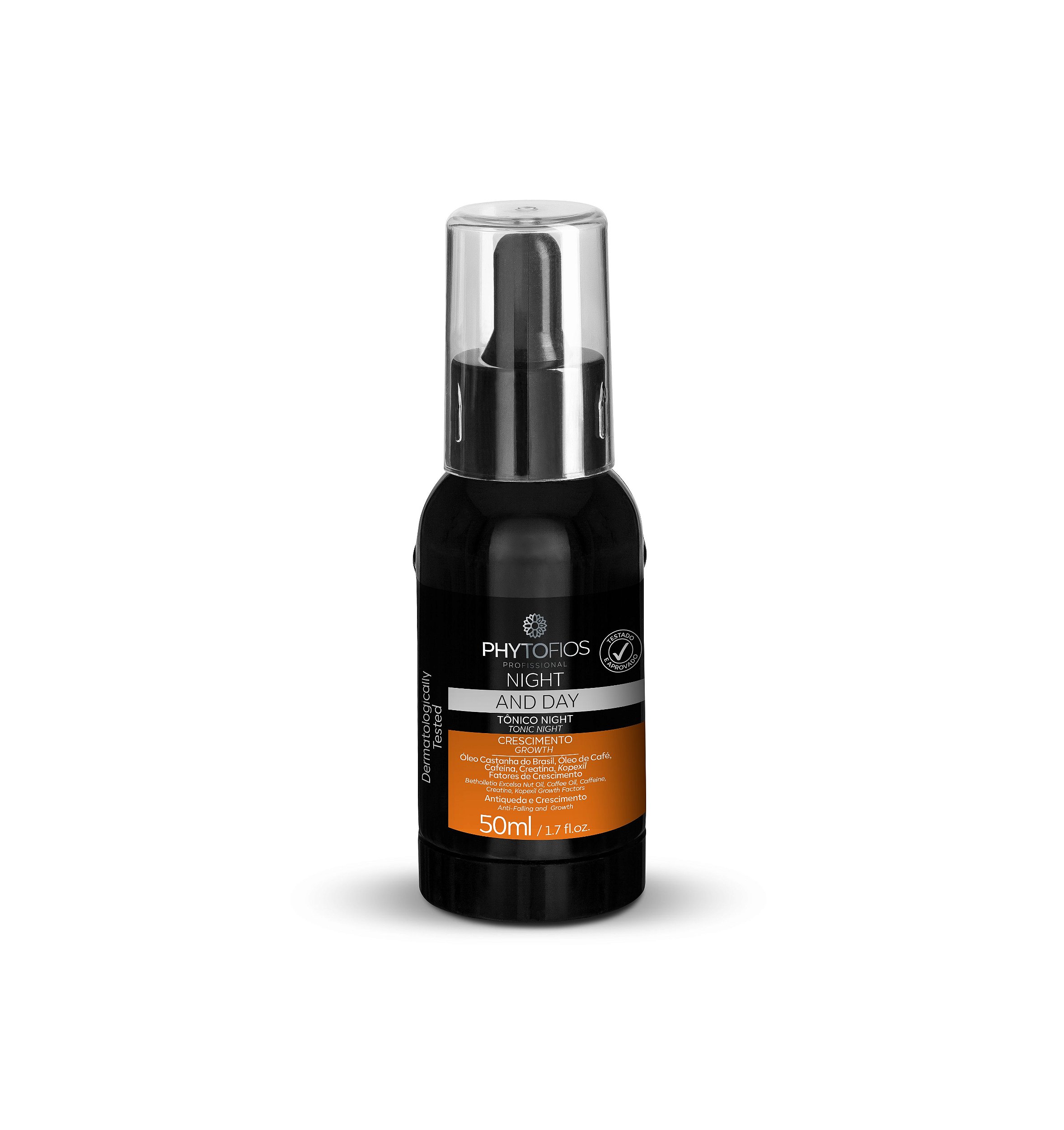 Finalidade: O Tônico Noturno Antiqueda e Crescimento Capilar Night and Day Phytofios, trata os fios. Sua fórmula exclusiva é desenvolvida a base de creatina, biotina, cafeína, e óleo de café verde, mais Kopexil, fatores de crescimento, óleo de Castanha do Brasil, auxina tricógena e nano trioxidil, que em sinergia gera um potente tônico antiqueda e crescimento capilar, com testes comprobatórios de usa eficácia.
